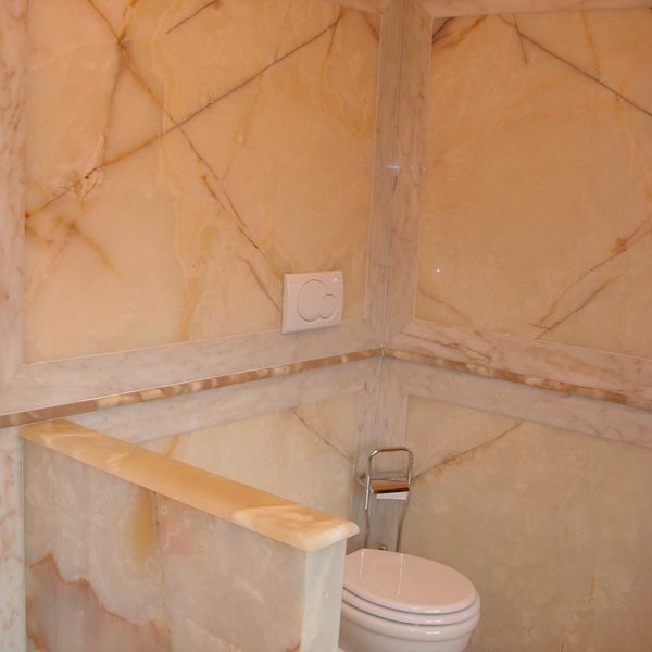 Rivestimento rosa afyon, top in onice e ovolina in rosé del Portogallo, massello sotto top.