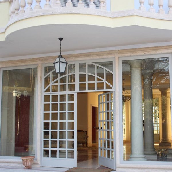 Balconi e cornici in travertino con balaustre in travertino a massello.