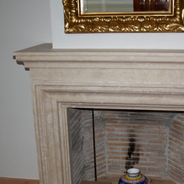 Caminetto in travertino romano a massello. Realizzato con cornice sagomata e antichizzata.