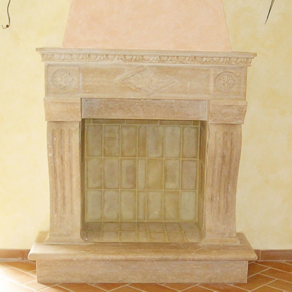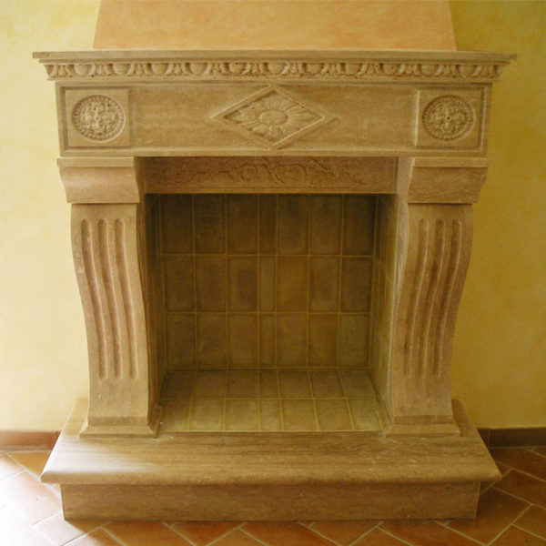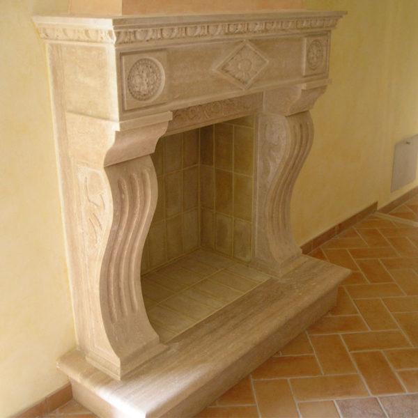 Camino in travertino classico con stipiti abbombati che presentano delle scorniciature sul fronte ed un fiore a rilievo nei laterali.