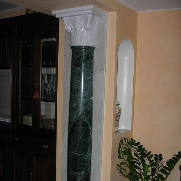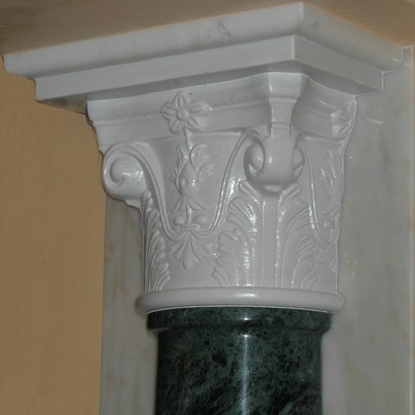 Mezza colonna in verde Guatemala a massello arricchita da un maestoso capitello di ordine Corinzio in marmo bianco Sivec. Rispettando l’antico ordine greco-romano il capitello è decorato con foglie d’acanto. La paretina posteriore è di Rosa Afyon.