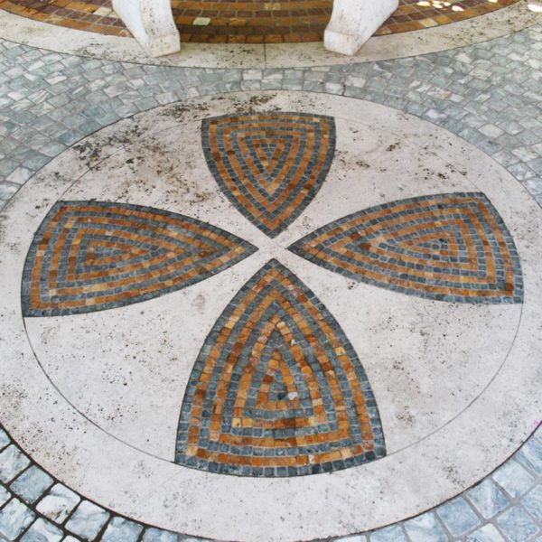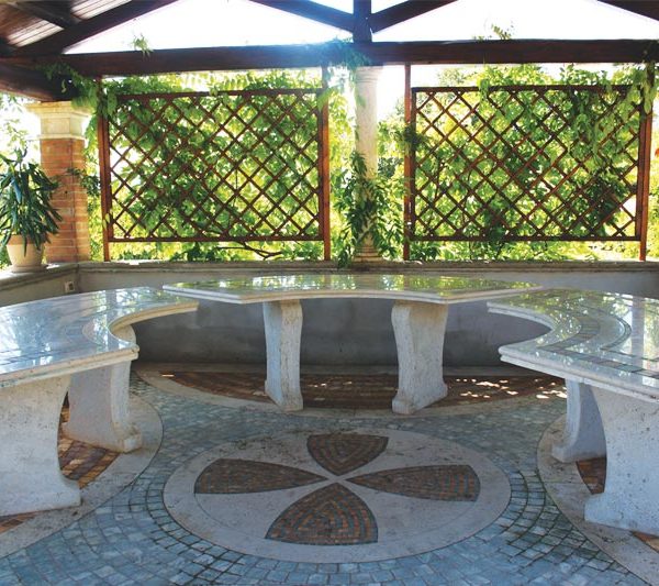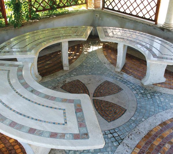 Gazebo da giardino in muratura, pavimentazione eseguita con tecnica del mosaico intarsiato nel travertino.