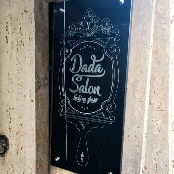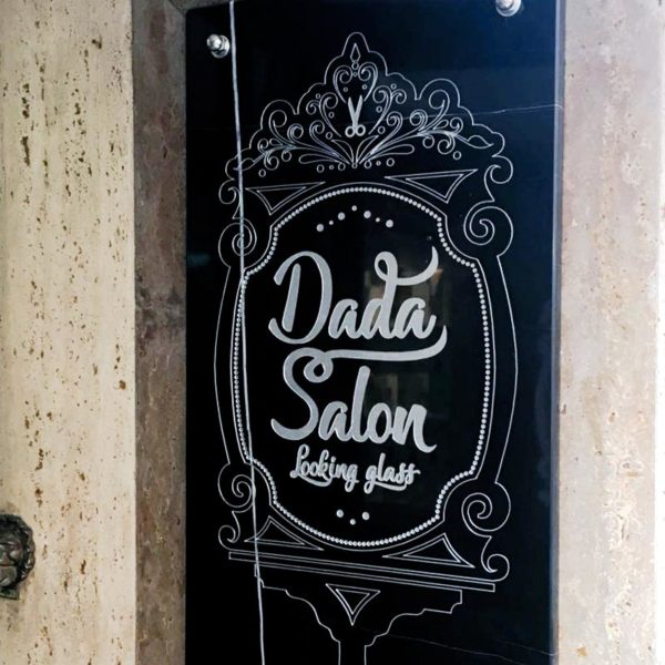 Incisione di un vettoriale per l’insegna di un negozio, colorata di argento su marmo nero Marquinia
