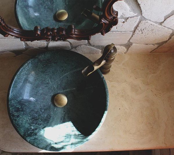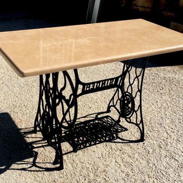 Ovolina verde guatemala scavato a massello, poggiato su un piano di travertino spazzolato lucido. Oggetto realizzato riciclando una vecchia struttura per macchina da cucire.