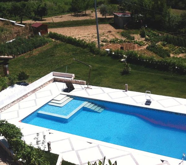 Pavimentazione esterna di una piscina, con travertino e pietra serena. panchine in