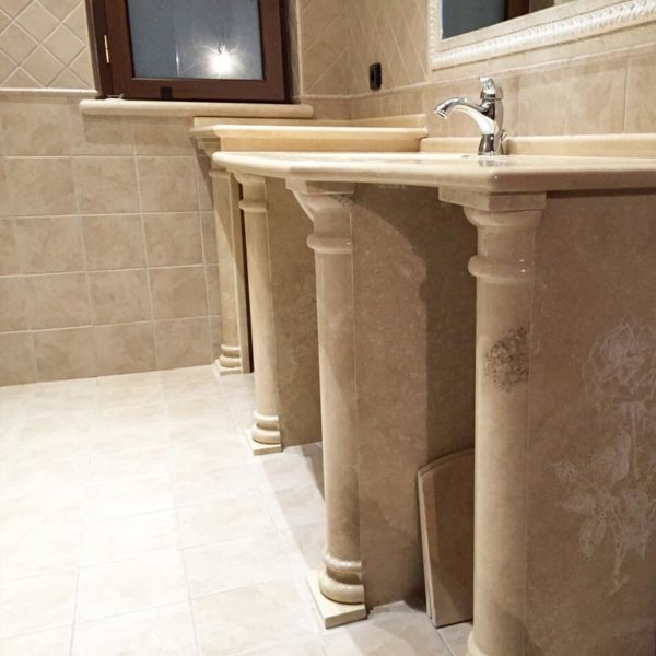 Top su 2 livelli in travertino lucido con baggioli in massello con finitura frontale in mezze colonne e particolare rosa incisa.